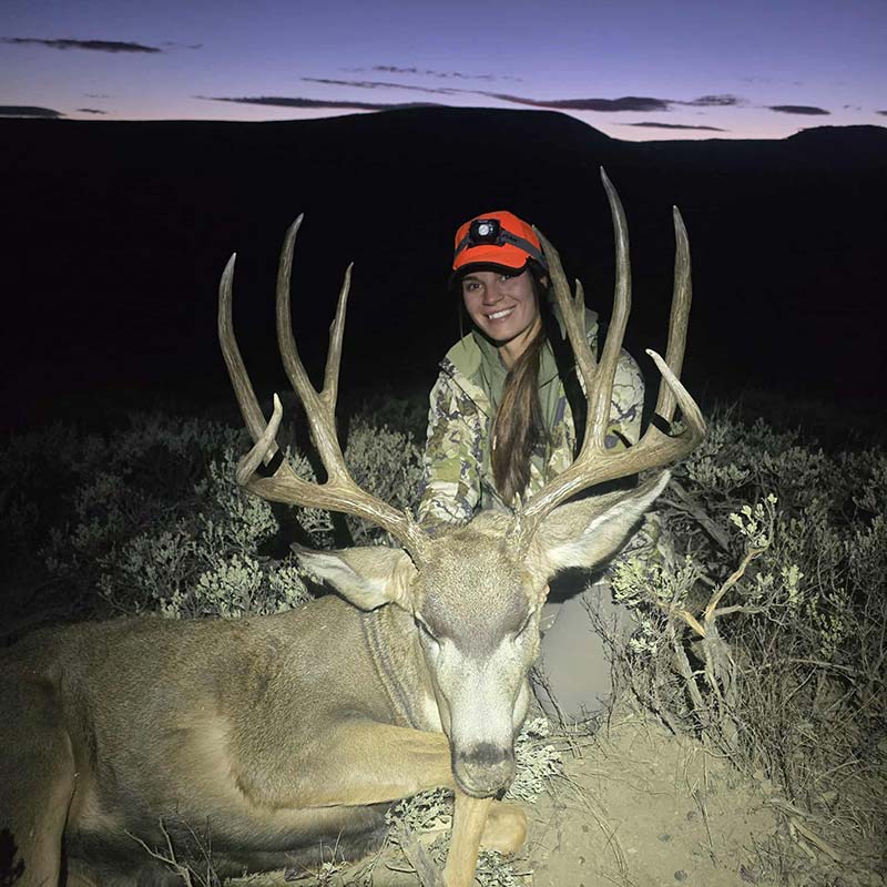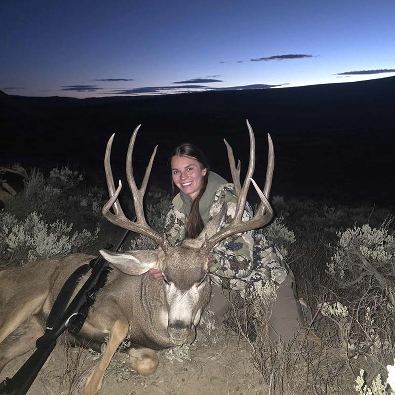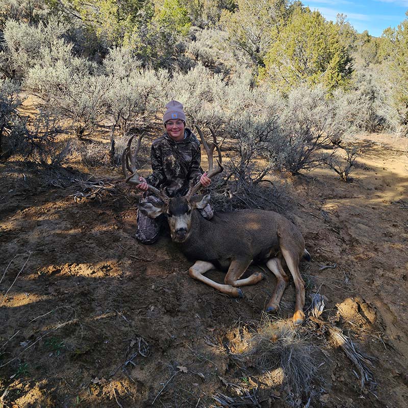 We head out opening morning. We came across a decent 2x2 smaller buck with couple of does. We passed him up and pushed further into the unit off of the highway. We had some friends out scouting around in the unit. One of our buddies glasses up this buck breeding on a couple of does in a small canyon. We make a move and work our way to put a stalk on. The buck and some does end up going over a hill and head on into another little canyon. We end up working both ends of this canyon. We had him spotted in a sage brush flat then he disappears. We gather back up with our help and make a plan to go to a hill top that over looks the canyon. We make our way to the hill top and spot those same deer and stay put. A couple of hours later after waiting the buck out hoping he is still down at the bottom, he shows his cards! He moves to stay in the shade and the set up couldn't be more perfect. He lays down facing away from us just to the side of a small juniper tree at around 172 yards. We all get set up, get kylee on her rifle. Her step-dad has her set up on a tripod with her rifle dialed in. She has buck fever and take a few minutes to gather herself. She finally loads a round and punches his ticket. Perfect shot! He doesn't even get up out of his bed. She did such an amazing job! We scored the deer and he measured out at 203". Just an awesome public land giant and for her first ever buck she couldn't have been more happier!